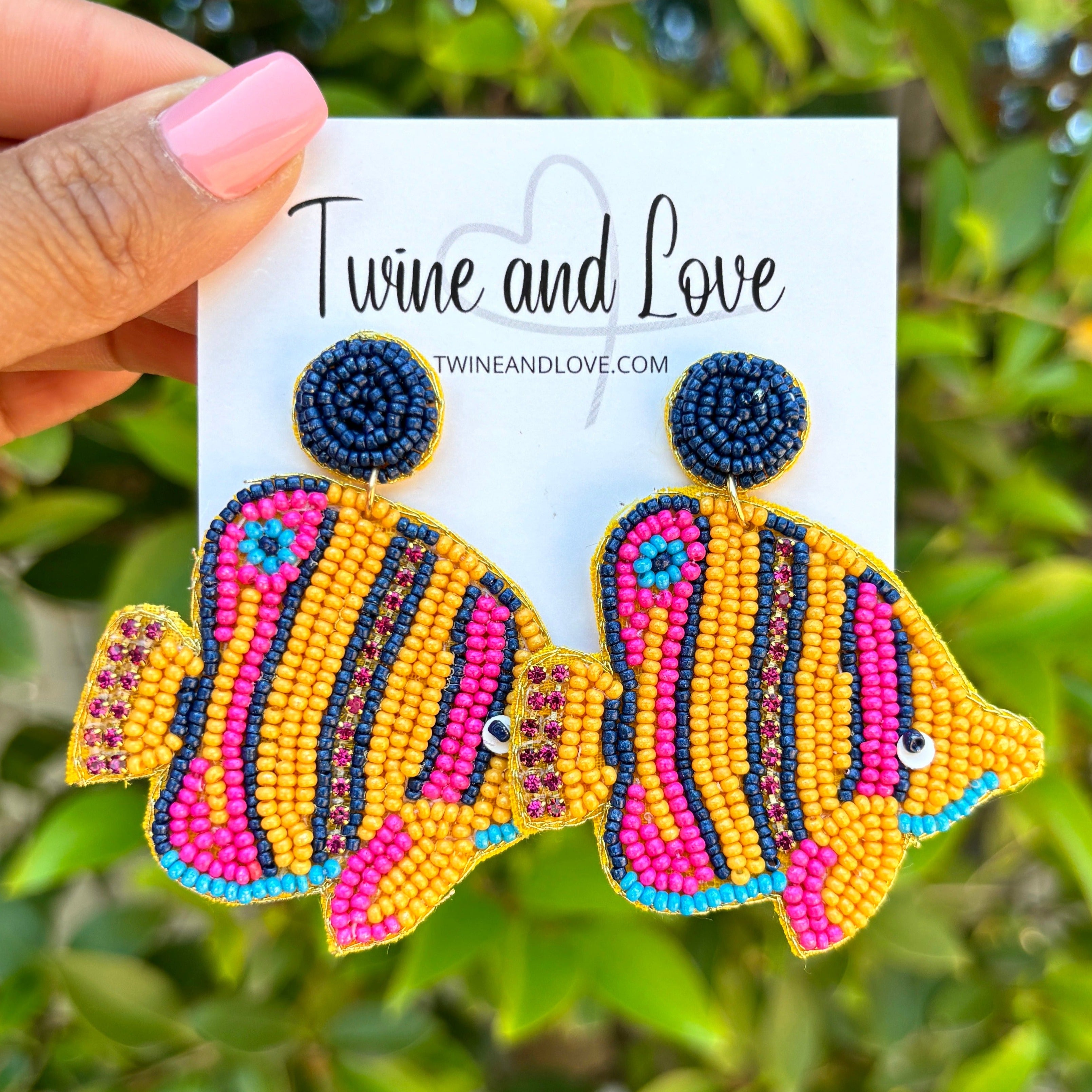 Elevate your style with our Yellow Pink Fish Beaded Earrings! Handmade with intricate details, these beautiful and lightweight earrings are perfect for any occasion. The chic combination of seed beads and jewels adds a touch of elegance to your look. Get ready for vacation with these stunning earrin...