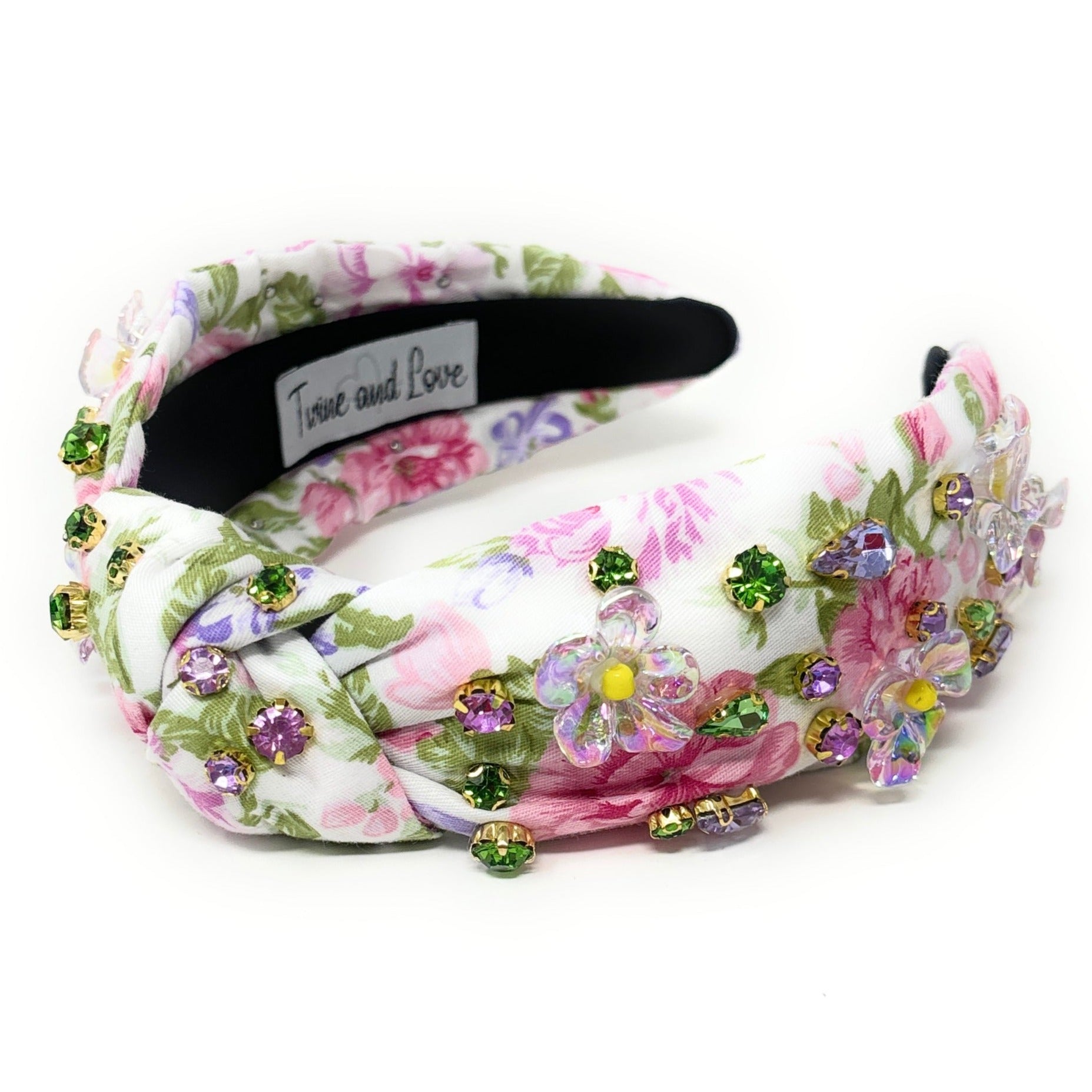Elevate your hair game with our handmade Zoe Jeweled Knot Headband! This chic and must-have accessory features a beautiful floral print, adorned with delicate floral charms, lavender and green jewels. The classic floral design adds a touch of sophistication, making it the perfect top knot headband f...